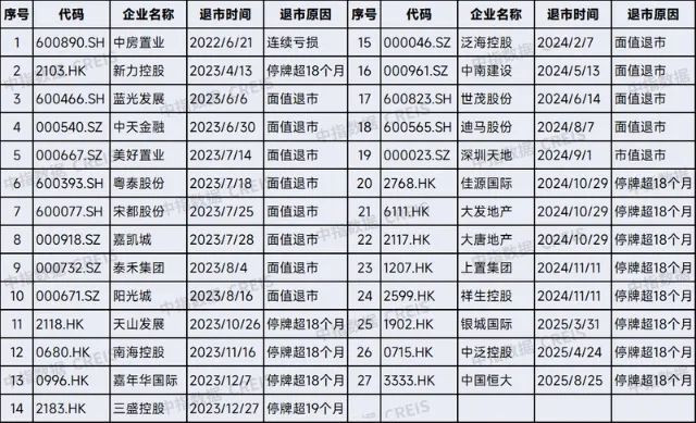 值得注意的是,受房地产市场深度调整等多重因素影响,2022年至今已有27家上市房企被动退市,其中A股14家,主因包括股价低于面值、连续多年亏损;H股13家,多因财报未能按时披露或未能达成复牌要求,连续停牌超过18个月。